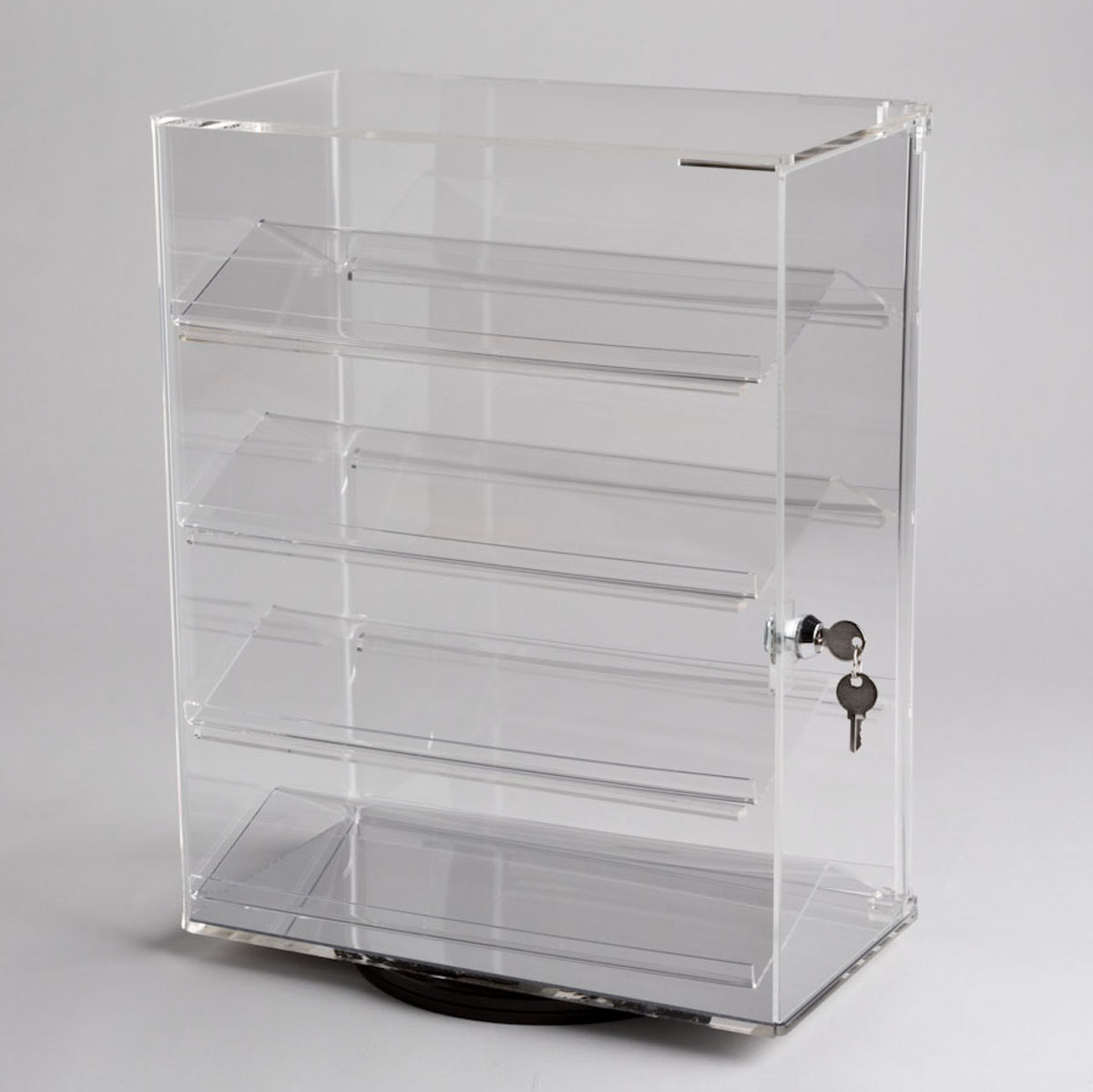 A&B Store Fixtures’ acrylic counter top display case revolves on a metal base. The case has 4 angled shelves,and is a great item to display a range of products up close to your customers. The sturdy clear acrylic construction and rotating base provides 360 degrees of viewing with the security of a keyed locking hinged door (lock & key provided). The shelves are ideal for watches and other boxed items, and can be removed to accommodate taller pieces (stands, etc.). Ships partially assembled (shelves need to be installed). Large inventory in stock.