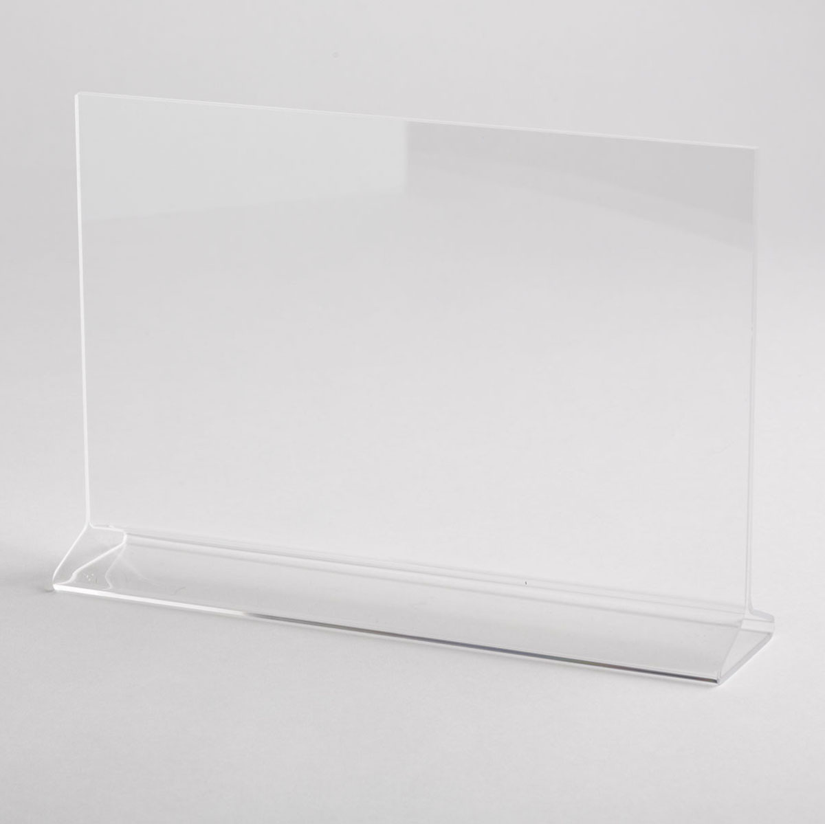 A&B Store Fixtures’ counter top sign holder is small and clear. This counter-top sign holder can be placed on any showcase, on a shelf or in your store front window. It is made of clear acrylic plastic and can be viewed by either side for 360 degree viewing. Large inventory in stock. Available in multiple styles. Loads from the top. It measures:
